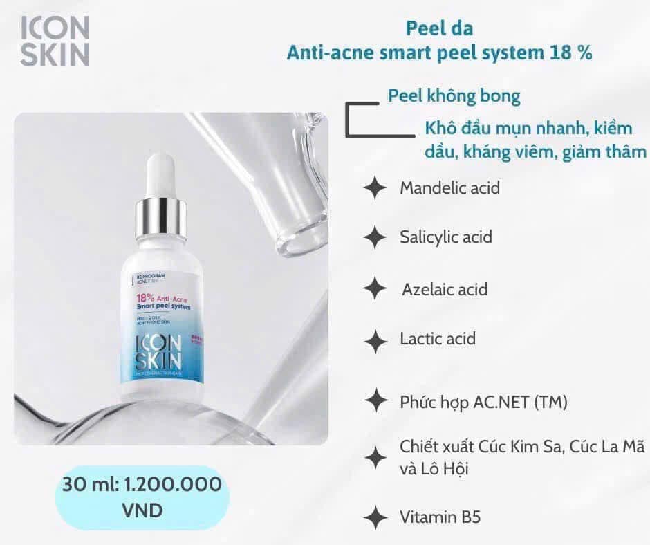 𝙂𝙞𝒂̉𝙞 𝙥𝙝𝒂́𝙥 𝙥𝙚𝙚𝙡 𝙙𝙖 𝙘𝙝𝙪𝒂̂̉𝙣 𝙮 𝙠𝙝𝙤𝙖 𝙘𝙝𝙤 𝙡𝒂̀𝙣 𝙙𝙖 𝙢𝒖̣𝙣 – 𝙩𝙝𝐚̂𝙢 – 𝙨𝒂̂̀𝙣 𝙭𝒊̉𝙣. Không bong tróc – Không kích ứng – Không đỏ rát. Chỉ cần 1 liệu trình, bạn sẽ cảm nhận làn da sáng mịn – sạch mụn – đều màu rõ rệt. CÔNG THỨC KHOA HỌC ĐỘC QUYỀN Axit Mandelic 18% – làm sạch tế bào chết, cải thiện bề mặt da mụn. Axit Salicylic + Lactic – giảm bít tắc, hỗ trợ làm sáng và phục hồi. Chiết xuất thực vật – làm dịu, bảo vệ hàng rào da. Kết hợp thành hệ thống peel không bong – không downtime – an toàn mọi loại da. BỘ ĐÔI SẢN PHẨM ĐỒNG HÀNH 18% Anti-Acne Peel System – peel xử lý các vấn đề da mụn, thâm, sần. Ultra Skin Tonic – cân bằng & phục hồi da sau peel, giúp da khỏe hơn từng ngày.
